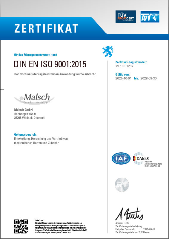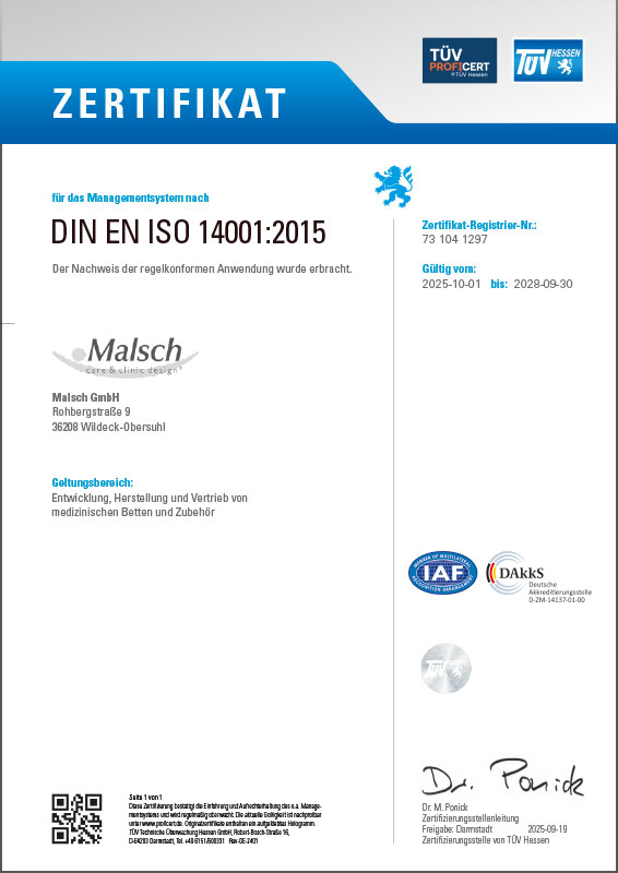 Das Unternehmen Malsch GmbH ist zertifiziert für das Managementsystem nach DIN EN ISO 9001:2015, 13485:2016 und 14001:2015.