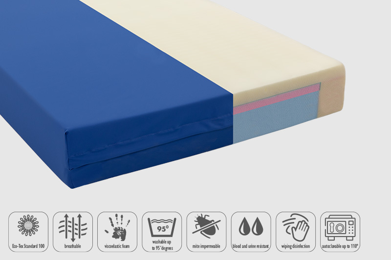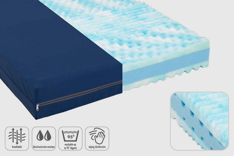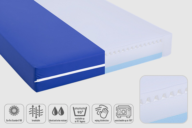 3-layer mattress, Bretex HR cold foam mattress core RG 40 and LLQ foam RG 55 with egg crate structure on both sides for excellent pressure relief